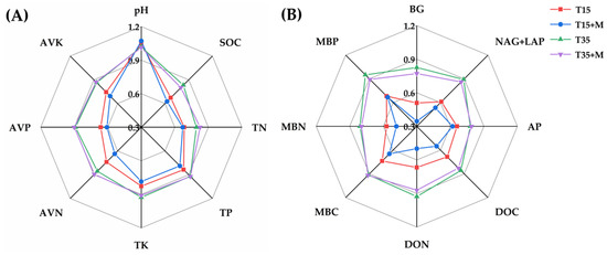 Soil nutrient contents in the 0–15 cm layer were higher than those in the 15–35 cm layer, while soil pH showed an opposite trend (Table 2). Generally, T35+M treatment had the highest SOC and soil nutrient contents. SOC content in the 0–15 cm layer with the highest value was found under T15+M treatment, whereas T35+M treatment in the 15–35 cm layer resulted in the highest value compared to other treatments. Soil TN, TP, TK, AVN, AVP, AVK, DOC, and DON contents followed a similar pattern as SOC content. Soil pH in the 15–35 cm layer had no significant difference between T15 and T15+M treatments. Compared to T15 treatment, SOC content in the 0–15 cm layer was significantly increased by 7.9% under T15+M treatment and significantly increased by 15.1% and 18.3% in the 15–35 cm layer under T35 and T35+M treatments, respectively (Table 2, p < 0.05). Compared to T15 treatment, soil total nutrient contents (TN, TP, and TK) in the 0–15 cm layer were significantly increased by 3.4–5.5% under T15+M treatment, and in the 15–35 cm layer were significantly increased by 5.1–10.8% and 7.9–17.7% under T35 and T35+M treatments, respectively (Table 2, p < 0.05). Compared to T15 treatment, soil available nutrient contents (AVN, AVP, and AVK) were significantly increased by 5.9–14.2% in the 0–15 cm layer under T15+M treatment, and in the 15–35 cm layer were significantly increased by 3.8–18.0% and 9.4–27.3% under T35 and T35+M treatments, respectively (Table 2, p < 0.05). In addition, T15+M treatment significantly increased the DOC and DON contents in the 0–15 cm layer by 24.6% and 34.6% compared to T15 treatment, and T35 and T35+M treatments significantly increased the DOC and DON contents in the 15–35 cm layer by 12.7–20.4% and 27.6–30.3% compared to T15 treatment, respectively (Table 2, p < 0.05).