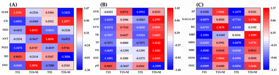 Heat map analysis of soil properties in different treatments. Notes: T15, conventional tillage with no organic fertilizer; T15+M, conventional tillage with organic fertilizer; T35, inversion tillage with no organic fertilizer; T35+M, inversion tillage with organic fertilizer; SWC, soil water content; BD, soil bulk density; POIT, soil porosity; ANT, anisotropy; FRD, fractal dimension; CIL, pore circularity; ELER, Euler number; SOC, soil organic carbon; TN, soil total nitrogen; TP, soil total phosphorus; TK, soil total potassium; AVN, soil available nitrogen; AVP, soil available phosphorus; AVK, soil available potassium; DOC, soil dissolved organic carbon; DON, soil dissolved organic nitrogen; MBC, soil microbial carbon; MBN, soil microbial nitrogen; MBP, soil microbial phosphorus; BG, β-1,4-glucosidase; NAG, β-1,4-N-acetylglucosaminidase; LAP, leucine aminopeptidase; AP, alkaline phosphatase. Soil physical properties (A), chemical properties (B) and dissolved organic matter, microbial biomass, and extracellular enzymatic activities (C). The numbers represent the strength of the correlation between different treatments and soil properties.