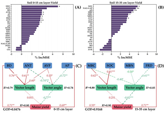 Effects of soil properties on maize yield. Random-forest analysis of the importance of the factors affecting maize yield (A,B). **, p < 0.01; *, p < 0.05. The partial least-squares path model (C,D) was used to identify the possible pathways by which attributes controlled the maize yield. SWC, soil water content; BD, soil bulk density; POIT, soil porosity; ANT, anisotropy; FRD, fractal dimension; CIL, pore circularity; ELER, Euler number; SOC, soil organic carbon; TN, soil total nitrogen; TP, soil total phosphorus; TK, soil total potassium; AVN, soil available nitrogen; AVP, soil available phosphorus; AVK, soil available potassium; DOC, soil dissolved organic carbon; DON, soil dissolved organic nitrogen; MBC, soil microbial carbon; MBN, soil microbial nitrogen; MBP, soil microbial phosphorus; BG, β-1,4-glucosidase; NAG, β-1,4-N-acetylglucosaminidase; LAP, leucine aminopeptidase; AP, alkaline phosphatase. The numbers on the arrows indicate significant standardized path coefficients. Red solid and green dashed arrows indicate positive and negative relationships, respectively. R2 indicates the variance of the dependent variable explained by the model. ***, p < 0.001; **, p < 0.01; *, p < 0.05.