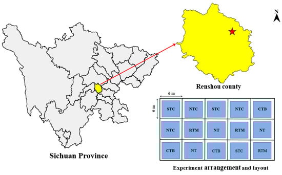 The field experiment was conducted in Community 2, Tashui Village, Zhujia Town, Renshou County, Sichuan Province (29°51′15.58″ N, 104°12′41.56″ E). Located in the south of Chengdu Plain, it is the most typical hilly area of southwest China. The experimental site has a subtropical monsoon humid climate. The average annual air temperature is 17.4 °C, the average annual sunshine duration is 1196.6 h, and the average annual precipitation is 1009.4 mm. The rainfall is unevenly seasonally distributed throughout the year and is mainly concentrated from June to August. The agricultural soil type in the experimental area is purple soil with weathered shale as its parent material, and its texture is sticky and heavy. In the World Reference Base for Soil Resources system classified as Cambisols. The basic physical and chemical properties of the soil at the experiment initiation are shown in Table 1.