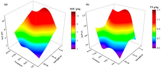 SOC content (a) and TN content (b) under different tillage modes in the 0–10 cm depth, 10–20 cm depth, and 20–30 cm depth of soil. Note: SOC: soil organic carbon (g/kg); TN: total nitrogen (g/kg).