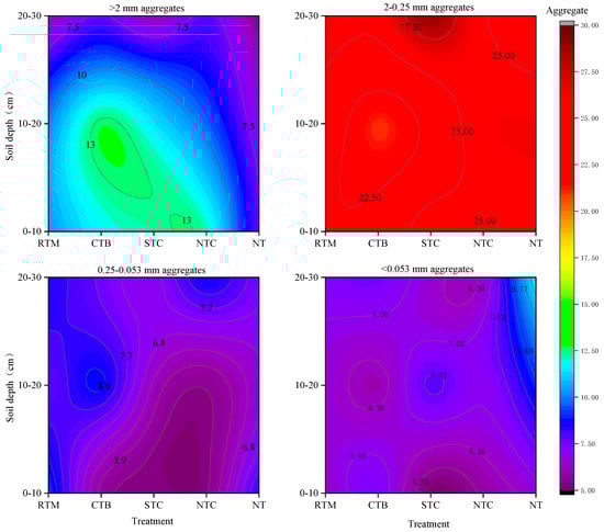 The research findings indicate that compared to NT, the RTM, CTB, NTC, and STC treatment modes all increased the organic C and total N content in soil aggregates of different particle sizes at different depths. Among them, the most significant increases in organic C and N in soil aggregates of 2–0.25 mm size in the upper plow layer were observed, with increases ranging from 34.77% to 49.71% and 72.06% to 89.71%, respectively. SOC and aggregate are closely related [], and soil aggregates protect C and N from the mineralization effect of microorganisms, enzymes, and soil degradation []. It is generally assumed that aggregates of large particle size can better reserve organic C than aggregates of small particle size [], as the large particle size aggregates consist of smaller particle size aggregates and adhesive materials []. The majority of SOC is contained within aggregates, which inhibits its decomposition by microorganisms and enhances soil structure stability. Traditional tillage practices are well-known for their significant soil disturbance, causing interconversion and redistribution among macroaggregates, large aggregates, and microaggregates. This process reduces soil aggregate structure stability and accelerates the loss of soil organic matter and nutrients [].