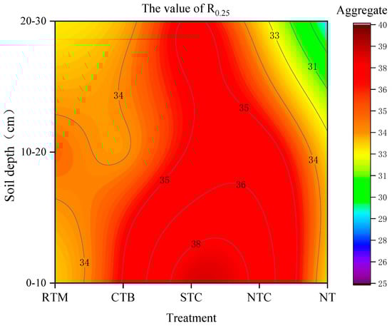The value of R0.25 under different tillage modes in the 0–10 cm depth, 10–20 cm depth, and 20–30 cm depth of soil. Note: RTM: rotary tillage with residue shredding and incorporation, CTB: plow tillage with residue burying and incorporation, NTC: no-tillage with residue covering and incorporation, STC: subsoiling with residue covering and incorporation, NT: no-tillage with residue removal.