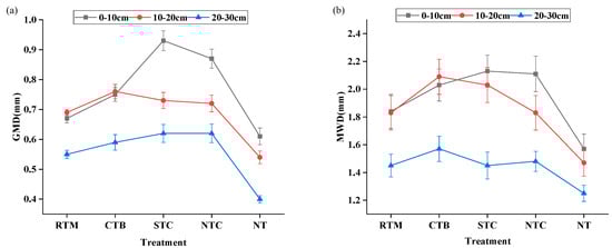 The value of GMD (a) and MWD (b) under different tillage modes in the 0–10 cm depth, 10–20 cm depth, and 20–30 cm depth of soil. Note: MWD: weight diameter of aggregates; GMD: geometric mean diameter of aggregates.