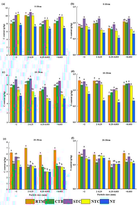 Aggregate organic C content under different tillage modes in the 0–10 cm depth (a), 10–20 cm depth (c), and 20–30 cm depth (e) of soil, aggregate total N content under different tillage modes in the 0–10 cm depth (b), 10–20 cm depth (d), and 20–30 cm depth (f) of soil. Note: C: aggregate organic carbon (g/kg); N: aggregate total nitrogen (g/kg). Different lowercase letters indicate significant difference among various treatment modes (p < 0.05).