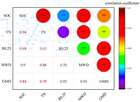 As shown in Figure 7, the SOC, TN, R0.25, MWD, and GMD were pairwise positively correlated. Moreover, except for TN and R0.25, which were significantly correlated (p < 0.05), all other indexes exhibited highly significant pairwise correlations (p < 0.01).
