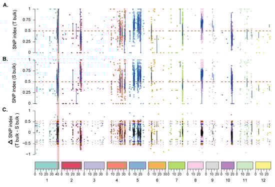 After mapping the cleaned reads from T-bulk and S-bulk to the KDML105 genome reference, 15,667 genome-wide SNPs and 11,935 InDels were detected with a read support of at least eight reads (Table 3). To obtain robust results, the common SNPs in the total of 8058 SNPs identified in T-bulk and S-bulk with a read support of at least 12 reads were used to perform the QTL-seq analysis (Table 3).