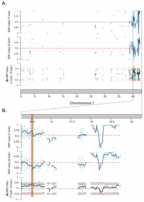 The extent of the QTL region detected on chromosome 1. (A) Diagrams illustrating the SNP index of T-bulk and S-bulk together with the Δ(SNP index) on chromosome 1. (B) The magnified region containing the significant SNPs. In addition, a red vertical bar in the figure indicates the top of the region.