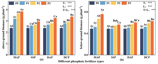 Aboveground biomass (a) and belowground biomass (b) of eggplant at seedling stage under different P fertilizer application rates. A, B, C, and D represent significant differences between types at the same level of P fertilizer, while a, b, c, and d represent significant differences between levels of the same P fertilizer type. T and L indicate the significance levels of two-factor ANOVA for P fertilizer type and P fertilizer level, respectively. *** p < 0.05 [35].