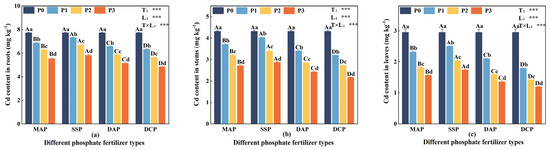 Cd content in eggplant at seedling stage with different P fertilizers. (a) Cd content in roots. (b) Cd content in stems. (c) Cd content in leaves. A, B, C, and D represent significant differences between types at the same level of P fertilizer, while a, b, c, and d represent significant differences between levels of the same P fertilizer type. T and L indicate the significance levels of two-factor ANOVA for P fertilizer type and P fertilizer level, respectively. *** p < 0.05.