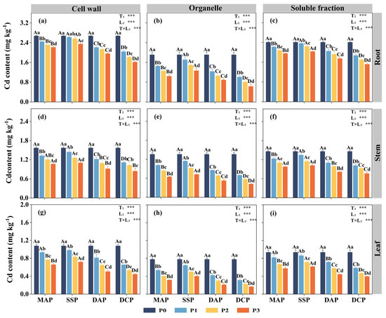 Subcellular distribution of Cd in various parts of eggplant seedlings treated with different P fertilizers. (a) Root cell wall Cd content. (b) Root organelle Cd content. (c) Root soluble fraction Cd content. (d) Stem cell wall Cd content. (e) Stem organelle Cd content. (f) Stem soluble fraction Cd content. (g) Leaf cell wall Cd content. (h) Leaf organelle Cd content. (i) Leaf soluble fraction Cd content. A, B, C, and D represent significant differences between types at the same level of P fertilizer, while a, b, c, and d represent significant differences between levels of the same P fertilizer type. T and L indicate the significance levels of two-factor ANOVA for P fertilizer type and P fertilizer level, respectively. *** p < 0.05.