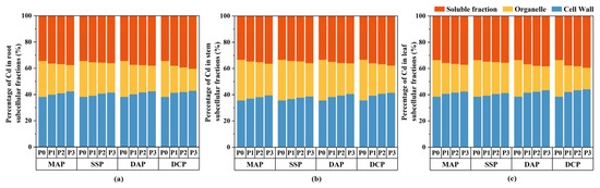 Proportion of Cd distribution in subcellular fractions in eggplant seedlings under different P fertilizer application rates. (a) Percentage distribution of Cd in root subcellular fractions. (b) Percentage distribution of Cd in stem subcellular fractions. (c) Percentage distribution of Cd in leaf subcellular fractions.