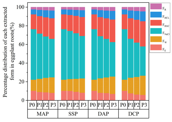 Two-way ANOVA revealed that the type and level of P fertilizer, along with their interaction, significantly (p < 0.01) influenced FE, FW, and FNaCl in seedling roots of eggplant under Cd stress (Table 2). Under the P0 condition, each extraction state in roots exhibited the order FNaCl > FHAC > FW > FHCL > FE > FR. The application of different types and levels of P fertilizers led to a decrease in FE and FNaCl and an increase in FW, FHAC, FHCL, and FR in eggplant roots. The application of P fertilizer led to changes in the proportions of each extractive state distribution in eggplant (Figure 5). The proportions of FNaCl and FE decreased gradually, while the proportions of FW, FHAC, FHCL, and FR increased. Notably, FNaCl still exhibited the highest proportion among the extractive states. Application of DCP at the P3 level decreased FE and FNaCl in eggplant roots by 65.45% and 64.65%, respectively, and increased FW, FHAC, FHCL, and FR in eggplant roots by 6.20%, 4.01%, 20.87%, and 17.85%, respectively, as compared to the P0 level. Regarding the assigned percentage for each chemical morphology, the FE percentage decreased by 43.43%, and the FHCL percentage significantly increased by 97.93% at the P3 level compared to the P0 level with the application of DCP. These were the two extraction states with the most pronounced increase and decrease in the percentage of chemical morphologies in eggplant roots.