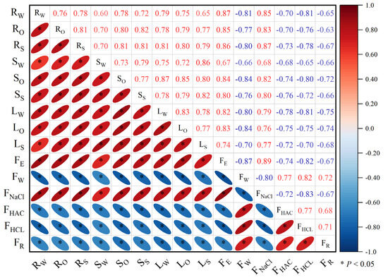 Correlation analysis revealed a significant correlation (p < 0.05) between the subcellular distribution of Cd in various parts of eggplant seedlings and the chemical morphology of Cd in roots (Figure 6). FE and FNaCl were significantly positively correlated with the subcellular distribution of Cd in roots, stems, and leaves of eggplants in the seedling stage, while FW, FHAC, FHCL, and FR were significantly negatively correlated with the subcellular distribution of Cd in roots, stems, and leaves of eggplants in the seedling stage. Following the application of P fertilizer, the subcellular distribution of Cd in various parts of eggplant seedlings decreased, causing a reduction in cell wall and protoplasmic membrane permeability and an increase in retention capacity. This led to a decrease in Cd bound to proteins, pectin, and other substances on the cell wall (FNaCl and FE) and an increase in the weakly migratory activity of FW, FHAC, FHCL, and FR.