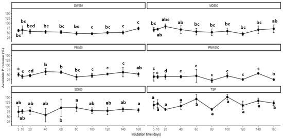 Available P release (%) considering the total P applied for each treatment throughout the incubation period. Each data point represents the mean and the standard deviation of four replicates. Tukey’s test was performed between treatments on each sampling day (t = 5, 10, 20, 40, 60, 80, 100, 120, 140, 160), where lower case letters (a–d) indicate significant differences among the products (p < 0.05).