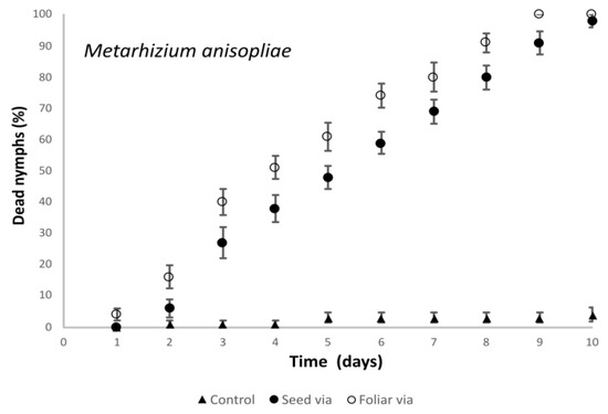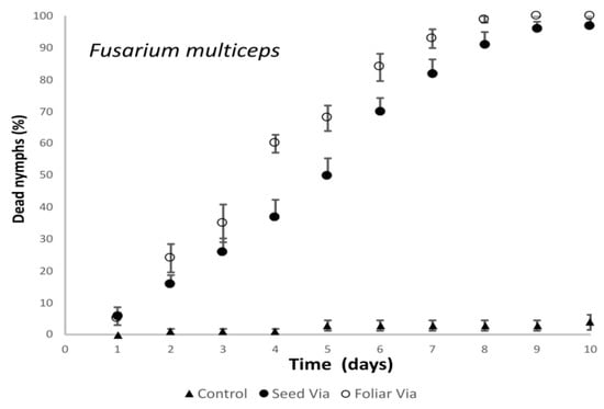 The cumulative percentage mortality of Mahanarva spectabilis nymphs fed on Urochloa brizantha plants inoculated via seeds or foliar spraying with the entomopathogenic fungus Fusarium multiceps UFMGCB 11443 or Metarhizium anisopliae UFMGCB 11444 or on non-inoculated control plants. The dots and bars indicate the means ± standard errors of 20 pots/fungi, with five nymphs per plant.