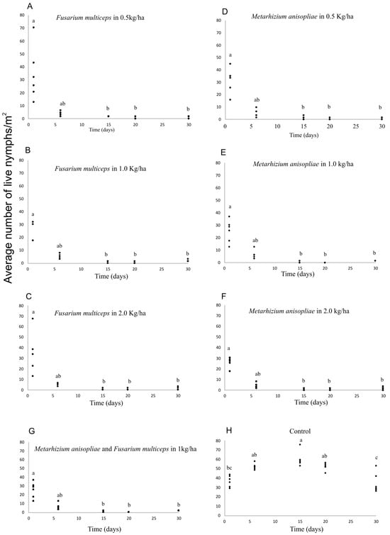 Average number of Mahanarva spectabilis nymphs/m2 in Urochloa brizantha pastures sprayed with the entomopathogenic fungus Fusarium multiceps UFMGCB 11443 (A–C) or Metarhizium anisopliae UFMGCB 11444 (D–F) at different concentrations (0.5, 1.0 and 2.0 kg/ha), with both fungi combined in the same solution (G), or with the control solution (H). The numbers of nymphs/m2 at different times with different letters were significantly different according to Dunn’s test (5% significance level) following the Kruskal–Wallis test, with six replicates per time point.