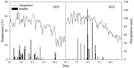 The research was conducted at Shuofeng Farm, Gaoyang County (38°56′ N, 115°94′ E), Hebei Province, China, spanning from 2022 to 2023. The total rainfall recorded during the maize growth period over the two-year study period was 373.6 mm and 530.2 mm, respectively. Figure 1 illustrates the rainfall and average temperatures observed during the maize growth phase. The soil at the experimental site, spanning 0–60 cm, exhibited a bulk density of 1.40 g cm−3 with a pH level of 8.0. Additionally, the soil contained 17.7 g kg−1 of organic matter, 1.07 g kg−1 of total nitrogen, 106 mg kg−1 of alkali-hydrolytic nitrogen, 40.7 mg kg−1 of available phosphorus, and 154 mg kg−1 of available potassium.