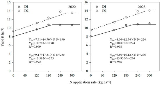 The relationship between the N application rate and yield exhibited a linear + plateau trend (Figure 3). In 2022, the highest yield of 10.70 t ha−1 was observed at a N application rate of 190 kg ha−1, and in 2023, the highest yield of 13.59 t ha−1 was recorded at a N application rate of 255 kg ha−1 for D2 density. At D1 density, in 2023, the highest yield of 10.87 t ha−1 was achieved with a N application rate of 224 kg ha−1, while at D2 density, the highest yield of 13.95 t ha−1 was obtained with a N application rate of 276 kg ha−1. Beyond the optimal N application rate, further increases did not significantly boost yield, indicating a wastage of nitrogen fertilization resources.