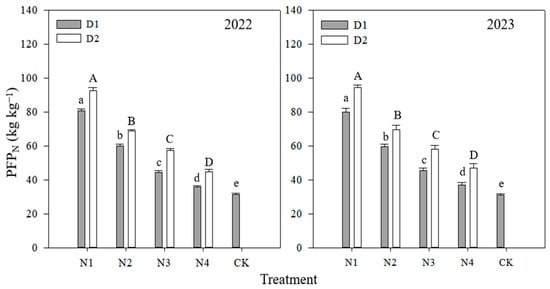 The nitrogen partial factor productivity (PFPN) of the different treatments from 2022 to 2023. Different lowercase letters indicate significant differences between different treatments of D1 density (p < 0.05). Different uppercase letters indicate significant differences between different treatments of D2 density (p < 0.05).