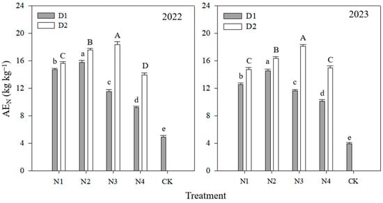 The nitrogen agronomic efficiency (AEN) of the different treatments from 2022 to 2023. Different lowercase letters indicate significant differences between different treatments of D1 density (p < 0.05). Different uppercase letters indicate significant differences between different treatments of D2 density (p < 0.05).