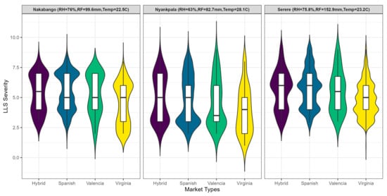 The LLS severity scores showed high disease pressure in all test locations (Figure 1). The medians in Figure 1 indicate that the disease was higher in Serere compared to Nakabango and Nyankpala. In addition, the Virginia market types generally had the lowest severity and disease spread across all locations. Within Nyankpala, the Valencia market types showed the lowest LLS severity, while in Nakabango, the hybrid type experienced the highest LLS severity compared to the Spanish, Valencia, and Virginia types which showed similar severities. In Nyankpala and Serere, the hybrid and Spanish types appeared to have been affected more by LLS compared to subspecies Virginia and Spanish.