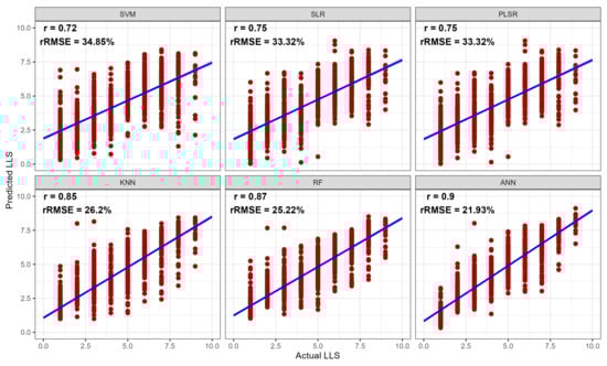 Associations between the actual and predicted LLS scores of the test dataset using six models derived from the testing dataset. The models were trained on 70% of the data and tested on 30% of the testing data. ANN—artificial neural network; KNN—K-nearest neighbors; PLSR—partial least-squares regression; RF—Random Forest; SLR—stepwise logistic regression; SVM—support vector machine.