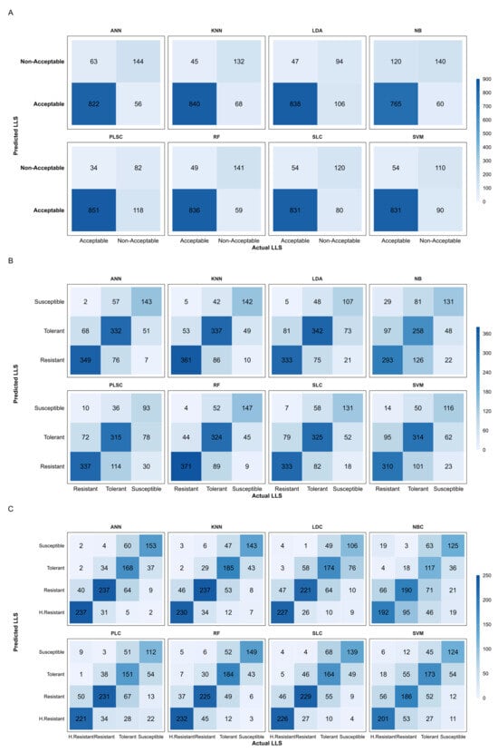 Confusion matrices of predicted and actual LLS categories of (A) binary classification, (B) 3-class multiclassification, and (C) 4-class multiclassification. The confusion matrices show the correctly classified and misclassified plots by the different methods. Each number and color placed in each box represents the number of plots classified by the different methods, and the diagonals in B and C represent classes correctly classified by the models. ANN—artificial neural network; KNN—K-nearest neighbors; LDA—linear discriminant analysis; NB—Naïve Bayes; PLSC—partial least-squares classification; RF—Random Forest; SLC—stepwise logistic classification; SVM—support vector machine.