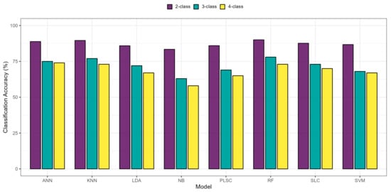 Comparison of the accuracy of the different classification models. (a) binary classification, (b) 3-class multiclassification, and (c) 4-class multiclassification using the different algorithms. ANN—artificial neural network; KNN—K-nearest neighbors; LDA—linear discriminant analysis; NB—Naïve Bayes; PLSC—partial least-squares classification; RF—Random Forest; SLC—stepwise logistic classification; SVM—support vector machine.