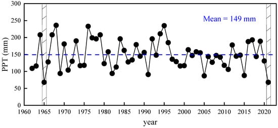 Interannual variation in annual total precipitation (PPT) during the June–August period of 1962–2021. The cross-hatched vertical areas show the years with the driest summers (1965 and 2021) during the past 60 years (1962–2021).