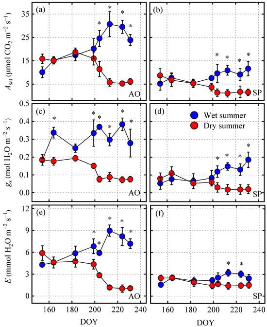 Seasonal difference in light-saturated net C assimilation rate (Asat, (a,b)), stomatal conductance (gs, (c,d)), and transpiration rate (E, (e,f)) in A. ordosica (AO, left-side panels) and S. psammophila (SP, right-side panels), respectively. Error bars represent standard error. Asterisks represent significant differences in each measurement point on the same DOY between wet and dry summers (p < 0.05).