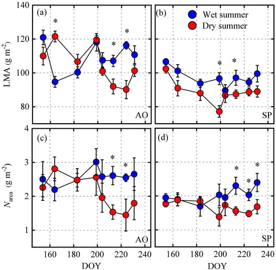 Seasonal variation in leaf mass and N content per leaf area (LMA, (a,b); Narea, (c,d)) associated with A. ordosica (AO, left-side panels) and S. psammophila (SP, right-side panels), respectively. Error bars represent standard error. Asterisks represent significant differences for individual measurements during the same DOY during both wet and dry summer periods (p < 0.05).