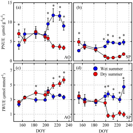 Seasonal variation in photosynthetic N and instantaneous water use efficiencies (PNUE, (a,b); IWUE, (c,d)) in A. ordosica (AO, left-side panels) and S. psammophila (SP, right-side panels) for the wet and dry summer periods, respectively. Error bars represent standard error. Asterisks represent significant differences for individual measurements during the same DOY during both wet and dry summer periods (p < 0.05).