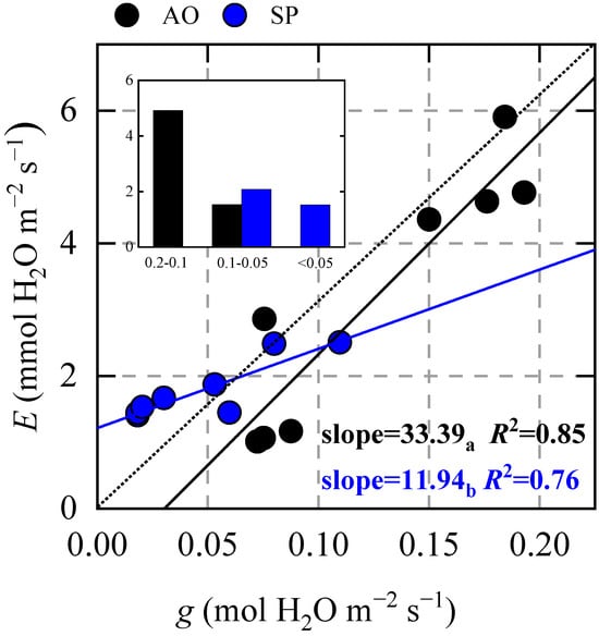 Relationships between transpiration rate (E) and stomatal conductance (gs) in A. ordosica (AO) and S. psammophila (SP) during summer drought. The inset illustrates changes in transpiration rate (E) under various levels of stomatal conductance (gs) in the two shrub species. The different subscripted letters assigned to slopes denote statistically significant differences (i.e., p < 0.05).