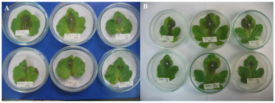 Ability of 1 mM Na2B4O7 to induce systemic protection in detached leaves. Leaves were detached from plants raised from seeds primed with either water (control) or Na2B4O7. (A) Lesion development on first developed true leaves of accession PI189225 at 4 days after inoculation and (B) on the second developed true leaf of accession 232-0125/B at 3 days after inoculation. Top rows in (A,B) show leaves from plants raised from seeds primed with water and lower rows in (A,B) show leaves from plants raised from seeds primed with 1 mM Na2B4O7.
