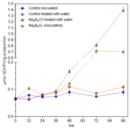 Total peroxidase activity (µmol guaiacol dehydrogenated product (GDHP)/mg protein/second) in watermelon leaves of accession 232-0125/B raised from seeds primed with 1 mM Na2B4O7 or water (control), followed by inoculation with S. cucurbitacearum or application of water. Error bars represent standard error of the mean.