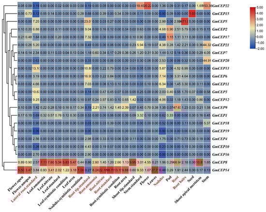 A dynamic expression Heatmap was constructed to dissect the soybean symbiotic related GmCEP genes; the online transcriptome data of nine soybean tissues covered most organs, and the developmental stages were analyzed. As shown in Figure 2, the results show that CEP genes had diverse expression patterns in different developmental stages of organs and tissues; for instance, most GmCEPs had similar expression levels in various tissues, while GmCEP22, GmCEP15, and GmCEP5 had extremely low expression in other tissues, except for a higher expression in one or two special tissues, which suggests that they might play a special role in their corresponding biological processes. In particular, we found that GmCEP6 was the highest expressed gene in root nodules among the 22 soybean CEPs, indicating that it might be involved in soybean and rhizobia interaction. Nitrogen, including nitrate, ammonia, and urea, had a significant effect on rhizobium infection and nodule initiation; the expression changes of the above three nitrogen treatments of roots and leaves were compared to standard values. We found that GmCEP6 was the only gene which was dramatically affected by the three kinds of nitrogen treatment of both the leaf and root.