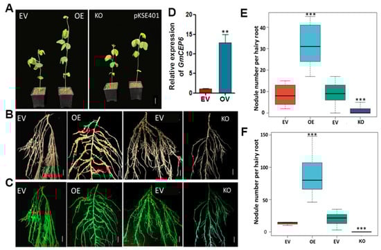 GmCEP6 regulates soybean symbiotic nodulation. (A) Soybean growth status of composite plants harboring empty vector, GmCEP6-OE, and GmCEP6-KO. (B) Nodulation performance of transgenic hairy root harboring empty vector, GmCEP6-OE, and GmCEP6-KO at 28 DPI. (C) Transgenic validation of hairy root harboring empty vector, GmCEP6-OE, and GmCEP6-KO using LUYOR-3415RG Hand-Held Lamp; GFP-positive roots were selected for further phenotype analysis. Scale bar in (B,C) = 1 cm. (D) Relative expression level of GmCEP6 in empty vector and GmCEP6-OE transgenic roots at 28 DPI were conducted to check the overexpression ratio; the expression value was normalized based on the expression of reference gene GmCYP2. (E) Quantitative data of nodule number per hairy root at 14 DPI. EV (empty vector for overexpressed transgenic roots) is the control. pKSE401 was the empty vector for CRISPR cas9 (KO). (F) Quantitative data of nodule number per hairy root at 28 DPI. EV: empty vector for overexpressed transgenic roots. pKSE401 was the empty vector for CRISPR cas9 (KO). These experiments were conducted on more than three dependent biological replicates. Data are means with ±SE (Standard Error) from three independent replicates (n = 12). Asterisks indicate significant difference within a p level in t-tests, ** p < 0.01; *** p < 0.001.