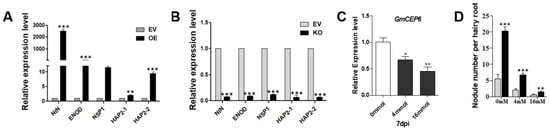 As soybean nodule numbers were significantly affected by GmCEP6 overexpression and GmCEP6 knock-out, we questioned whether GmCEP6 regulates soybean nodulation through the NF (Nodular Factor, NF) signaling pathway. To this end, we examined the expression pattern of several NF pathway marker genes in GmCEP6 overexpressed or knocked-out soybean roots. We selected GmENOD40 (Early nodulin), GmNINa (Nodule Inception), GmNSP1 (Nodulation Signaling Pathway 1), NF-YA1 (GmHAP2-1), and NF-YA2 (GmHAP2-2) to verify this [,,,]. As shown in Figure 5, the expression of GmNINa, GmENOD40, GmNSP1, GmHAP2-1, and GmHAP2-2 in GmCEP6-OE roots was significantly increased compared with that in empty vector control roots at 7 DPI. Meanwhile, we found the expression levels of these genes in GmCEP6-KO hairy roots were markedly reduced. These results suggest that GmCEP6 regulates soybean nodulation and nodule number controlling via modulating these symbiosis-related Nod factor signaling pathway genes.