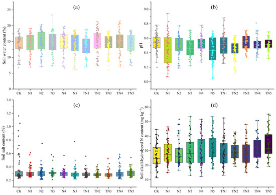 The mean soil water content (a), pH (b), soil salt content (c), and soil alkali-hydrolyzable nitrogen content (d) were affected by the different fertilizer types and application rates.