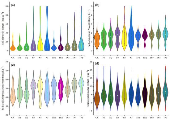 The soil nitrate nitrogen content (SNNC) and soil ammonium nitrogen content (soil ammonium nitrogen content) were extracted using 2 mol L−1 potassium chloride and indole blue colorimetry with a spectrophotometer (UV-2600, Shanghai Hengping Scientific Instrument Co., Ltd., Shanghai, China). The soil available potassium content (K) was extracted with ammonium acetate via flame spectrophotometry. Soil alkali-hydrolyzed nitrogen (SHNC) was determined via conductometric titration. Soil pH was measured with glass electrode pH meter (Horiba F-71S, Kyoto, Japan) (soil: water, 1:2.5). The soil organic matter (SOM) content was determined via the potassium dichromate volumetric method (external heating method).