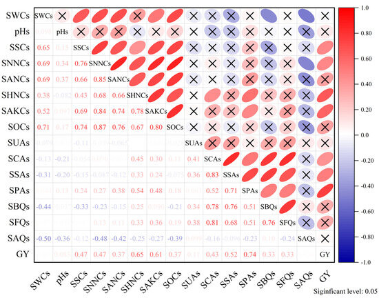 Correlations between grain yield and soil physical, chemical, and biological indicators in both years. Note: SWC, soil water content; pH, SSC, soil salt content; SNNC, soil nitrate nitrogen content; SANC, soil ammonium nitrogen content; SHNC, soil alkali-hydrolyzed nitrogen content; SAKC, soil available potassium content; SOC, soil organic matter content; SUA, soil urease activity; SCA, soil catalase activity; SSA, soil sucrase activity; SPA, soil phosphatase activity; SBQ, soil bacteria quantity; SFQ, soil fungi quantity; SAQ, soil actinomyces quantity; GY, grain yield.