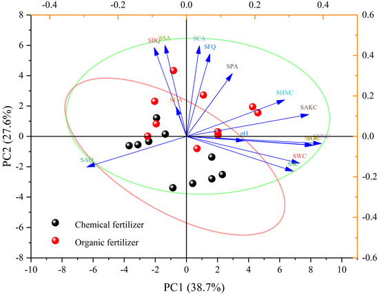 Principal component analysis of soil physical, chemical, and biological indicators in both years. Note: SWC, soil water content; pH, SSC, soil salt content; SNNC, soil nitrate nitrogen content; SANC, soil ammonium nitrogen content; SHNC, soil alkali-hydrolyzed nitrogen content; SAKC, soil available potassium content; SOC, soil organic matter content; SUA, soil urease activity; SCA, soil catalase activity; SSA, soil sucrase activity; SPA, soil phosphatase activity; SBQ, soil bacteria quantity; SFQ, soil fungi quantity; SAQ, soil actinomyces quantity.