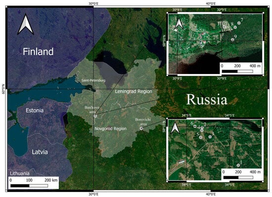 Worldwide, the problem of agricultural land conservation is a leading issue in the global fight against hunger [,]. Decisive steps are being taken to preserve, engage, and reclaim existing crop rotations on natural lands, as well as to monitor the water balance of these areas. According to the United Nations Food and Agriculture Organization (UN FAO), the area of agricultural land is about 4.8 billion hectares (37% of the world’s landmass) []. As of 1 January 2023, the area of agricultural land in Russia amounted to 318 million hectares. About 44 million hectares of agricultural land are not used, of which about 20 million hectares are arable land []. Fallow lands in Russia are quite diverse in terms of soil types, vegetation succession, and post-agricultural dynamics []. According to Gagarina [], the Northwest Federal Region includes the Leningrad, Novgorod, Pskov, and St. Petersburg regions. The history of arable land development began here at the end of the first millennium A.D., while counting-fire farming was known even earlier []. The cereal type of agriculture prevailed, the intensive development of animal husbandry is connected with the appearance of St. Petersburg, and a large amount of organic fertilizers, including manure, has appeared. In the vicinity of St. Petersburg, even the formation of thick superfertile soils—plaggen [], which are now built up in residential areas—is known. The northwestern physico-geographical region is almost entirely located in the Valdai glaciation zone [] and is a kind of “museum” of soil-forming rocks, which leads to the development of various scenarios of post-agrogenic soil evolution, including divergence and convergence of soil morphotypes and their chemical parameters. The least fertile soils are on the eluviae of granites and other massive crystalline rocks; the most fertile soils are characteristic of carbonate loams [].