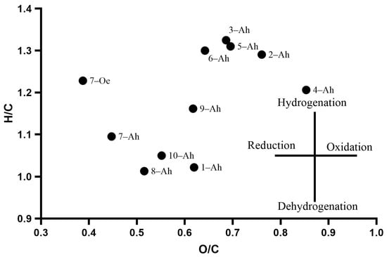 The van Krevelen diagram was used to graphically represent the elemental composition and the contribution of oxidation/reduction and hydrogenation/dehydrogenation processes in the studied HAs (Figure 2).