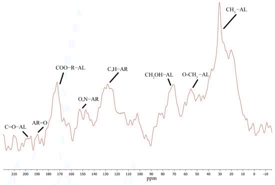 Numerous molecular fragments were identified by 13C (CP/MAS) NMR spectroscopy, which indicates the great complexity of the structure of HAs and polyfunctional properties [] (Figure 3).