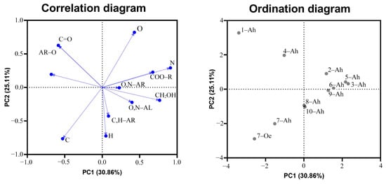 Based on the presented diagrams, we can note that the distribution of the study points along the principal component (PC1) is associated with variation in the content of nitrogen as well as the carboxyl group of structural fragments in HAs along PC2—aliphatic structural fragments (C, H—Alkyl), fragments of aldehydes and ketones (C=O), and aromatic structural fragments (Arom=O). Analysis of the ordination of structural fragments and elemental composition of HAs in the space of two principal components did not reveal a clear relationship between the studied objects, indicating heterogeneous conditions of humification and maturation of HAs.