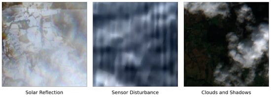 Figure 1. Examples of different types of noise in satellite images. Reprinted/adapted with permission from the authors Mikkel Andreas Kvande and Sigurd Løite Jacobsen, Hybrid Neural Networks with Attention-Based Multiple Instance Learning for Improved Grain Identification and Grain Yield Predictions. Masters Thesis; published by University of Agder, Grimstad, Norway, 2022 [17].