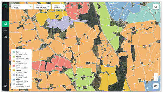 - Crop type delineation and mapping: Addressing the scarcity of agriculture-specific data in Norway, Kussul et al. [12] advanced a field classification framework, demonstrating high accuracy rates for both 1D and 2D models, particularly the latter, which interprets spatial context in satellite imagery or vegetation indices. Their progress in winter wheat classification underscores the value of phenological data in remote sensing of wheat grains. Additionally, DigiFarm’s (https://digifarm.io/, (accessed on 13 April 2024)) technology, which achieves a 92% accuracy rate in delineating field boundaries and identifying crop types via satellite imagery in specific locales, is notably pertinent to this research.