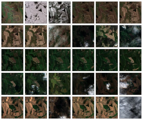 The authors utilised satellite images that can be obtained from orbiting satellites and are publicly accessible (https://www.sentinel-hub.com/ (accessed on 4 May 2024)). These provide detailed high-resolution observations of Earth. The authors acquired farm-based satellite images from 2017 to 2019, encompassing 30 images for each farm yearly. An example of all 30 raw satellite images of a farm in a given year can be seen in Figure 3. Each image comprises 12 spectral bands (https://sentinel.esa.int/web/sentinel/missions/sentinel-2 (accessed on 4 May 2024)), with distinct meanings, wavelengths, bandwidths, and resolutions detailed in Table 1. The acquisition period spanned from 1st March to 1st October, which aligns with Norway’s growing season.